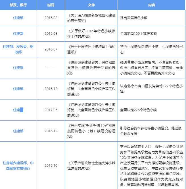 2016年以來,國家發(fā)改委、住建部聯(lián)合多個(gè)銀行出臺多項(xiàng)支持特色小鎮(zhèn)建設(shè)的政策文件及金融支持文件。