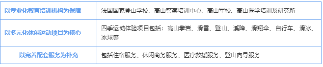 在法國,登山向?qū)︻櫩偷男袨槌袚?dān)法律責(zé)任,這些以技術(shù)高超、經(jīng)驗(yàn)豐富,責(zé)任感強(qiáng)而著稱的向?qū)冊谌澜缍枷碛惺⒆u(yù)。國立登山滑雪學(xué)校開設(shè)的項(xiàng)目有登山向?qū)?、滑雪教練、高山協(xié)作、救援、滑翔傘教練。學(xué)校設(shè)備齊全,配有六個(gè)可容納20至80人的會議室、一個(gè)可容納220人且配有錄像投影機(jī)的階梯教室、一棟配有132個(gè)標(biāo)間的宿舍樓、一個(gè)自助餐中心、一個(gè)健身房、一個(gè)器材室及其它科研場所。因?yàn)?/b>ENSA的存在,沙木尼成為全球登山標(biāo)準(zhǔn)的定制者,完善的培訓(xùn)和卓越的服務(wù)成為其登山產(chǎn)業(yè)發(fā)展的護(hù)城河。