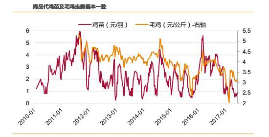 理論上,在產(chǎn)父母代存欄的變動(dòng),3周后將傳導(dǎo)到雞苗環(huán)節(jié)。但實(shí)際上,由于商品代離消費(fèi)者最近,需求端的影響要大于供給端的影響。從數(shù)據(jù)上看,雖然商品代雞苗由于沒(méi)有庫(kù)存,產(chǎn)品價(jià)格波動(dòng)幅度遠(yuǎn)大于毛雞價(jià)格的波動(dòng)幅度,但是兩者之間的走勢(shì)卻基本一致,間隔最多不會(huì)超過(guò)1周。因此,判斷毛雞價(jià)格走勢(shì)基本等價(jià)于判斷雞苗價(jià)格。