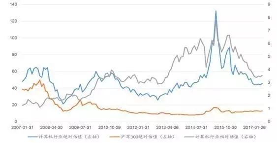 2007年至今計算機行業(yè)及滬深300股票絕對估值及計算機行業(yè)相對估值情況